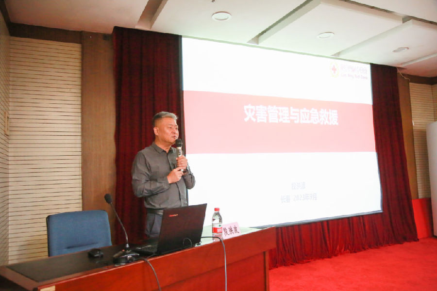 省红十字会筹资与财务部李征就中国红十字会总会捐赠工作管理办法及灾害时红十字会接收捐赠和发放等工作进行授课和讲解。