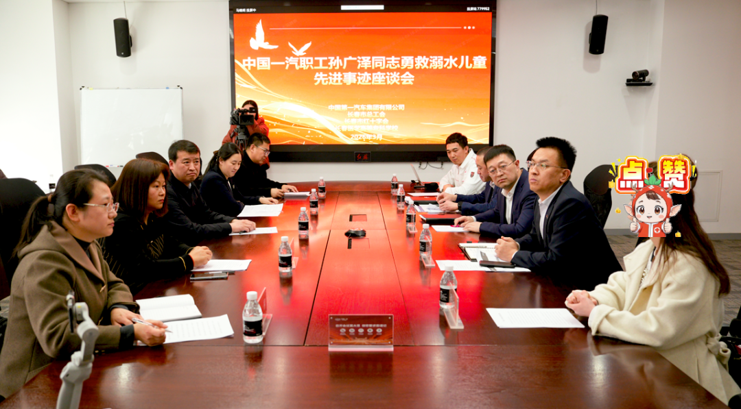 勇救溺水儿童的主人公、中国一汽职工孙广泽,被救儿童母亲暴女士,长春市红十字会党组书记、专职副会长孙盛锋,长春医学高等专科学校党委委员、副校长赵欣,长春市总工会保障部部长陆璐,中国一汽安全环境保障部副总经理郑锐、集团工会副主席姬小明、质量保证部副总经理姜海等共同参加了此次座谈会。