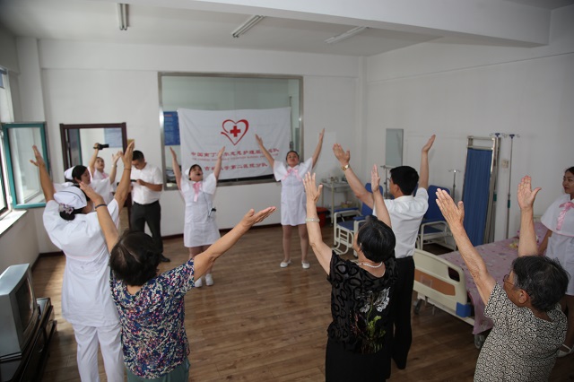 活动现场,干休所离职老军人及遗属与中国南丁格尔志愿护理服务队吉林大学第二医院分队共同作心肺健康保健操。