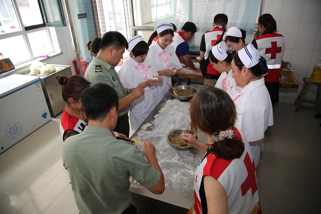 活动中,红十字志愿者与干休所官兵一起包饺子,共庆“八一”建军节。
