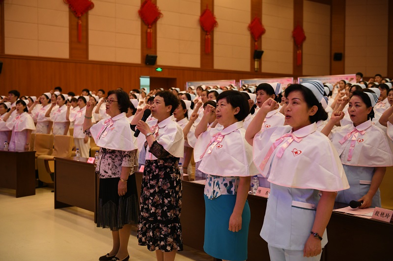 全体护理志愿者在第42届南丁格尔奖章获得者张桂英的带领下,高举右手宣誓,我们将践行红十字“人道、博爱、奉献”精神,以南丁格尔为榜样,开展护理志愿服务,尽己所能,服务社会,为维护健康、传播健康理念、促进社会和谐进步积极贡献力量。