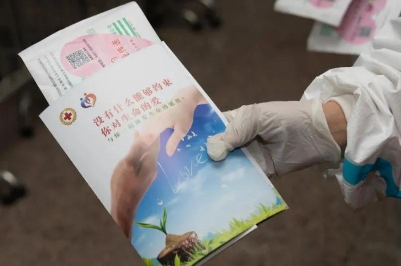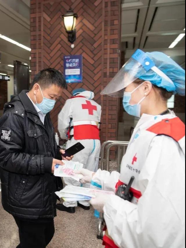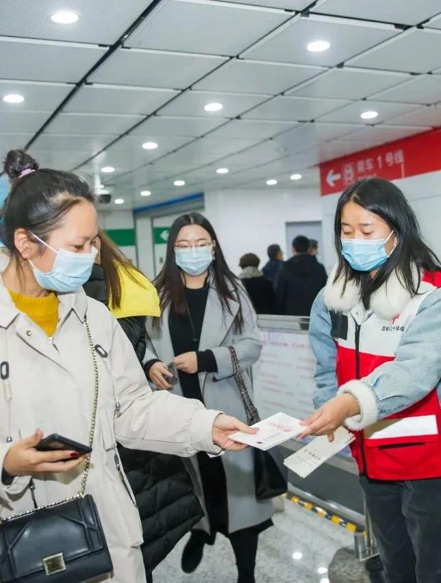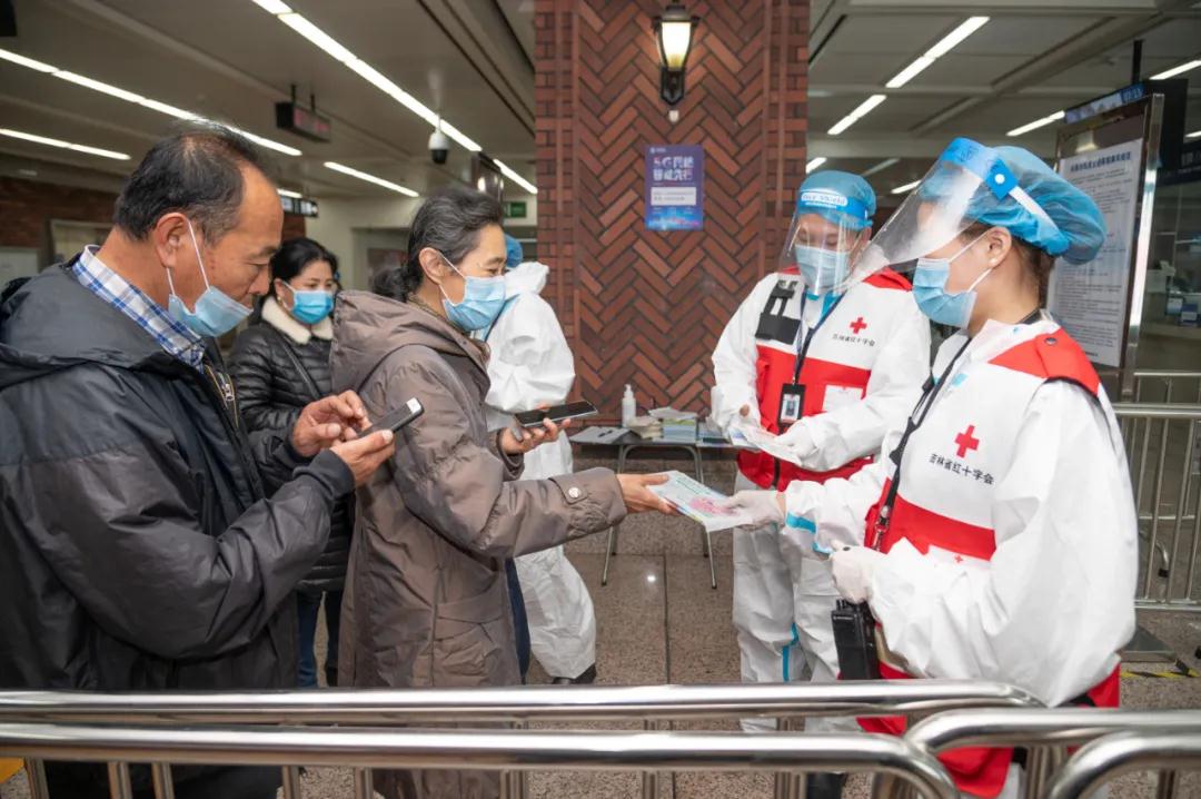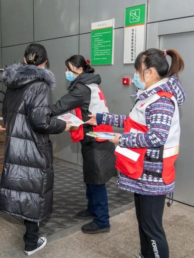 活动中,身穿红十字马甲的志愿者们分别在轨道交通13座车站前,免费向乘客发放防疫口罩及人体器官捐献活动宣传手册。