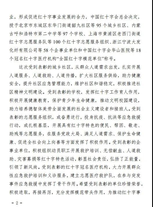 日前,为表彰先进,推动社会各界更加广泛地参与和支持红十字事业,形成促进红十字事业发展的合力,中国红十字会总会决定,授予368个单位、组织“全国红十字模范单位”荣誉称号。对近年来为推动红十字事业发展做出突出贡献、开展红十字工作取得良好成效的城乡社区、学校、红十字志愿服务组织和企事业单位等进行表彰。